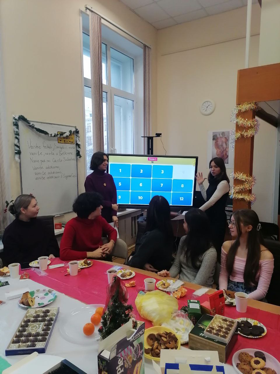26 декабря Итальянский Центр пригласил своих студентов и их друзей отпраздновать Рождество. Первокурсники узнали много нового об итальянских зимних праздниках, познакомились с известными рождественскими песнями, посмотрели фильм о пропавшем пандоро, отведали панеттоне и выиграли множество призов, отвечая на вопросы викторины, которую подготовили для них студенты старших курсов.